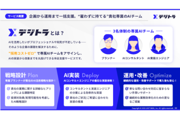 『デジトラ』は、AI導入を検討する企業に対し、専属のAIチーム(プランナー/AIコンサルタント/実装エンジニア)が伴走支援する月額制のAI導入支援サービス。