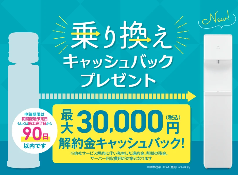 | 強み | 月額2,580円(税込み)~の定額で、ペットボトル・宅配水より大幅なコスト削減を提示できる ボトルレスで在庫・廃棄・運搬の手間がゼロ UV殺菌・エコモードなど、法人でも安心して置ける機能が標準搭載 他社サービスの解約金キャッシュバックで乗り換え提案がしやすい |
