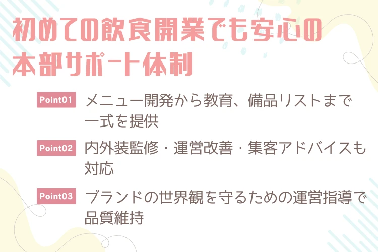 本部サポートにより、メニュー提供方法・必要備品・店舗運営の流れが体系化されており、運営面での負担を減らせるため、生産性を高めながらの経営が可能です。イベント販売やテイクアウト販売も検討できるため、複数の販売チャネルで利益を積み上げられる点も強みです。