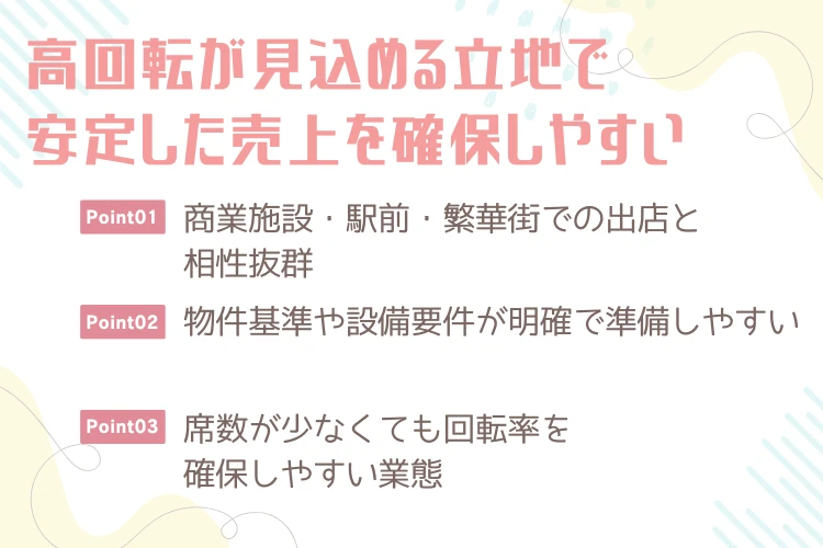 | マージン率 | 収益モデルは、売上から原価・人件費・家賃・ロイヤリティを差し引いた営業利益を基礎とする構造です。ロイヤリティはブランド運営・店舗サポートに充当され、加盟店は支援を受けながら利益向上を目指せます。詳細な利益率や収益モデルは、立地や店舗規模により変動するため、資料で個別に案内しています。ご興味があればお気軽に資料請求ください。 |