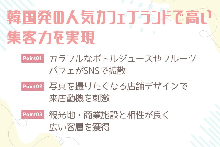 | 市場性 | 韓国トレンドのスイーツ・カフェ市場は国内で安定成長しており、SNS中心の購買行動により“映える商品”の需要が継続的に伸びています。韓国カルチャーは根強い人気があり、インバウンド需要の回復も追い風となっています。カフェ業態はドリンク・スイーツ・物販など複数の収益源を持てるため、飲食カテゴリーの中でも利益構造が安定しており、市場性の高いビジネスモデルです。 |