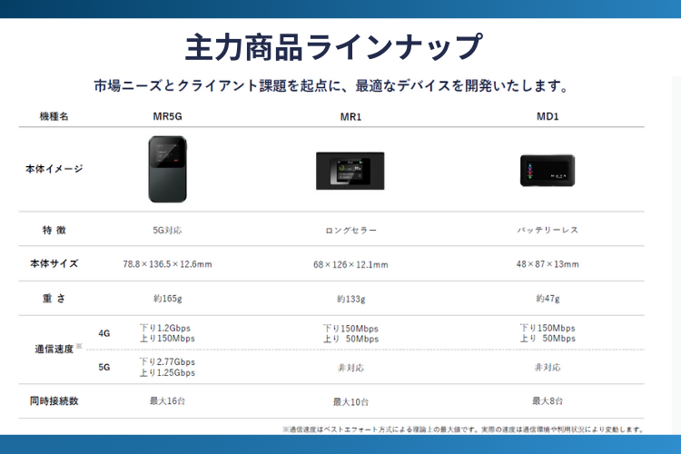 代理店様には、WiFiルーター端末(MR5G/MR1/MD1などの主力モデル)の販売・レンタル提案に加え、通信サービスを組み合わせたビジネスを展開いただけます。販売モデル・レンタルモデルのいずれにも対応でき、代理店様独自の通信プラン(料金体系・容量設計など)を構築することも可能なため、既存顧客のニーズに合わせた柔軟な提案が行えます。