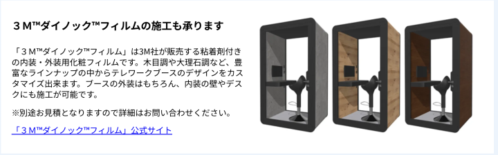 | 市場性 | 新型コロナの影響によりテレワーク、オンライン商談が普及したことで個室型ワークブースのニーズが拡大しています。オフィスだけでなく教育機関、交通機関など様々な場所で設置が進んでいます。 |
