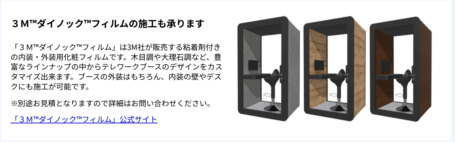 | 強み | 弊社が企画から販売・配送・設置までをグループ会社を含めた自社で行っていること、また必要以上の在庫を持たないようにすることで、お客様が導入しやすい価格での販売を実現しております。 また、AdvaNceD IoTテレワークブースをお試しで3ヵ月間ご利用いただけるトライアルプランや毎月定額でテレワークブースをご利用いただけるサブスクプラン、リースでの提供も可能です。 |