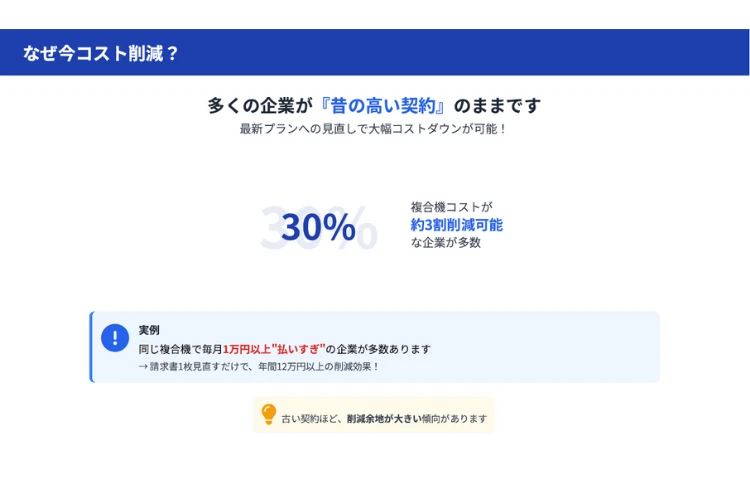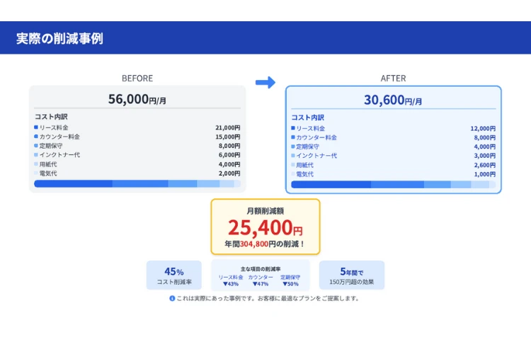 複合機の請求書を1枚お預かりして診断したところ、リース料金・カウンター料金・保守費用の見直しにより、月額25,400円、年間で304,800円の削減が可能となった事例があります。この提案を行ったのは、既存で法人営業を展開していた代理店企業で、普段から取引のある中小企業に対して「コスト最適化の無料診断」を案内したことがきっかけでした。