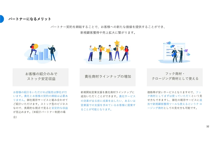 お客様への製品紹介・営業を行っていただきます。契約手続きは弊社が行い、貴社には【最大25%の紹介マージン】 をお支払いします。お客様がサービスを利用している限り(最長1年間)、安定したストック収益が見込めます。