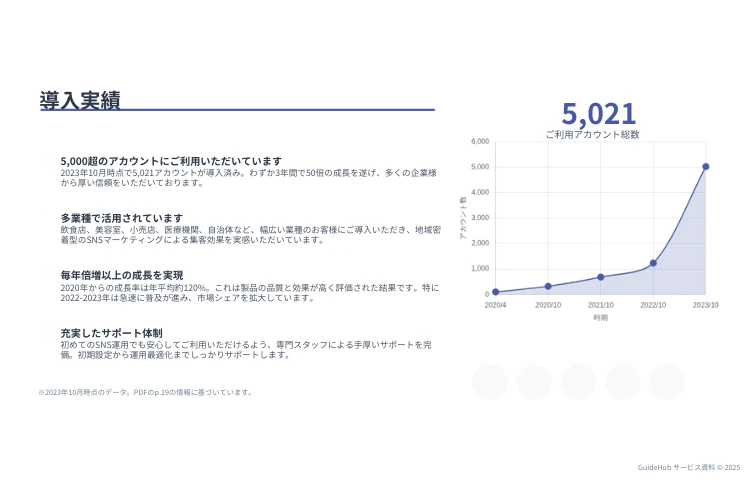 「GuideHub」は、InstagramやTikTokの運用を「感覚」から「データ」へと進化させる、総合SNSマーケティングプラットフォームです。導入アカウント数はわずか3年で5,000件を突破し、年平均120%の成長を続けています。