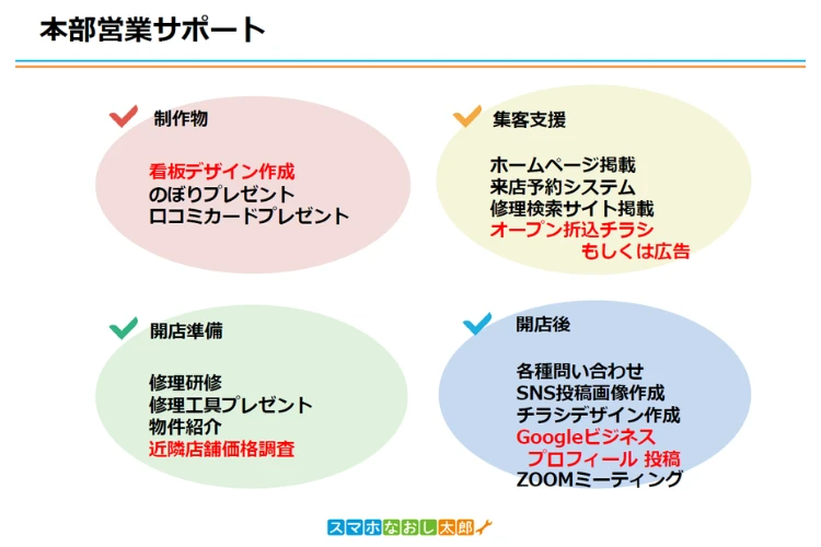 | サポート体制 | スマホなおし太郎では、未経験の方でも安心して開業・運営できるよう、本部によるサポート体制を整えています。修理技術研修をはじめ、修理工具の提供、物件紹介、近隣店舗の価格調査、各種問い合わせ対応など、開業準備から運営までを支援します。 また、チラシやSNS投稿用画像の作成、Googleビジネスプロフィールの活用、ホームページ掲載、来店予約システム、修理検索サイトへの掲載など、集客面のサポートも充実しています。開店後もZOOMミーティングや販促物の提供を通じて、継続的なフォローを行っています。 |