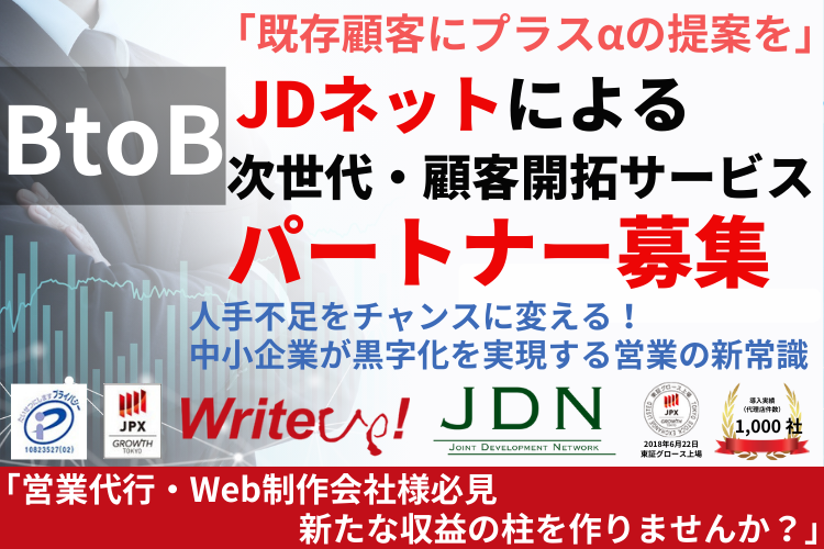 | 顧客の特徴 | ターゲットは、全国に約325万社存在すると言われる中小企業および小規模事業者です 。 特に、商品や技術力はあるものの「営業マンが採用できない」「新規開拓のノウハウがない」という課題を抱える企業がメインの顧客層となります。労働人口の減少に伴い、多くの経営者が「人を雇うリスク」と「集客の必要性」の板挟みになっています 。 こうした企業に対し、「社員を雇わずに、プロの営業チームとAIを持てる」というJDネットの提案は非常に刺さりやすく、潜在ニーズは膨大です。業種を問わず、赤字からの脱却や事業拡大を目指す全ての企業がアプローチ対象となるため、リストが尽きることがありません 。 |