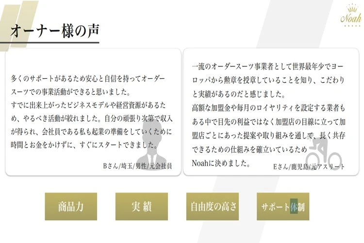 「オーダースーツ Noah 」のフランチャイズ加盟募集 成功事例