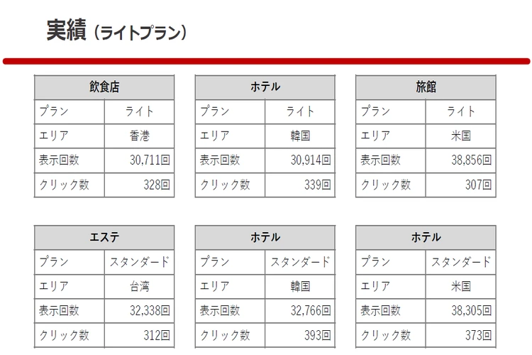 | 顧客の特徴 | 本サービスの主な顧客は、訪日外国人の集客を求めるホテル、旅館、飲食店、観光施設、美容サロンなど。特に韓国・台湾・アメリカ・香港・タイからの旅行者を対象とする商業施設との親和性が高く、地域密着の販促活動にも適しています。配信するサイトは訪日前にユーザーがよく閲覧する大手旅行系サイトに限定されているため、高確度の見込み顧客に接触可能です。 |