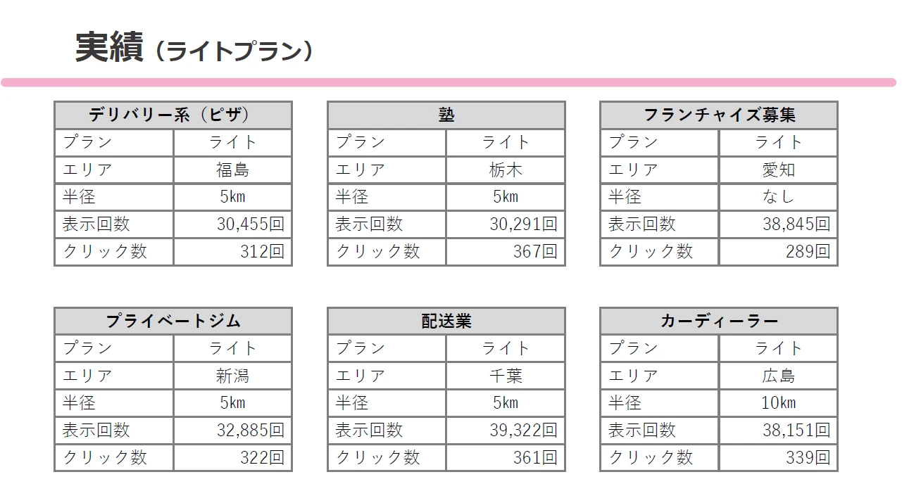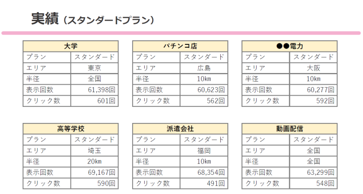| 顧客の特徴 | 地域密着型の飲食店、クリニック、整骨院、学習塾、フィットネスジム、不動産会社、葬儀屋など来店型の店舗事業者が主なターゲットです。 指定するホームページは90%以上が競合他社のホームページを指定します。 広告配信するエリアは平均3㎞が多いです。 性別、年齢、デバイスも指定できるので効率良く集客したニーズと非常にマッチします。 非常に安価なため、初めてWEB広告は実施する店舗様も非常に多いのが特徴的です。 |