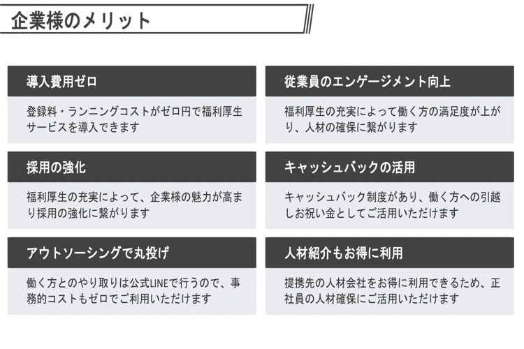 | 顧客の特徴 | 対象となるのは、中小企業で人材定着・採用強化に課題を抱える法人。特に人手不足業界(飲食・小売・介護など)に対して効果的で、従業員に対する住宅支援を福利厚生として導入したいと考える経営者層に刺さります。従業員数10名〜100名規模の企業に導入されやすく、訪問営業やテレアポ、紹介営業などでも商談化しやすい点が特徴です。 |