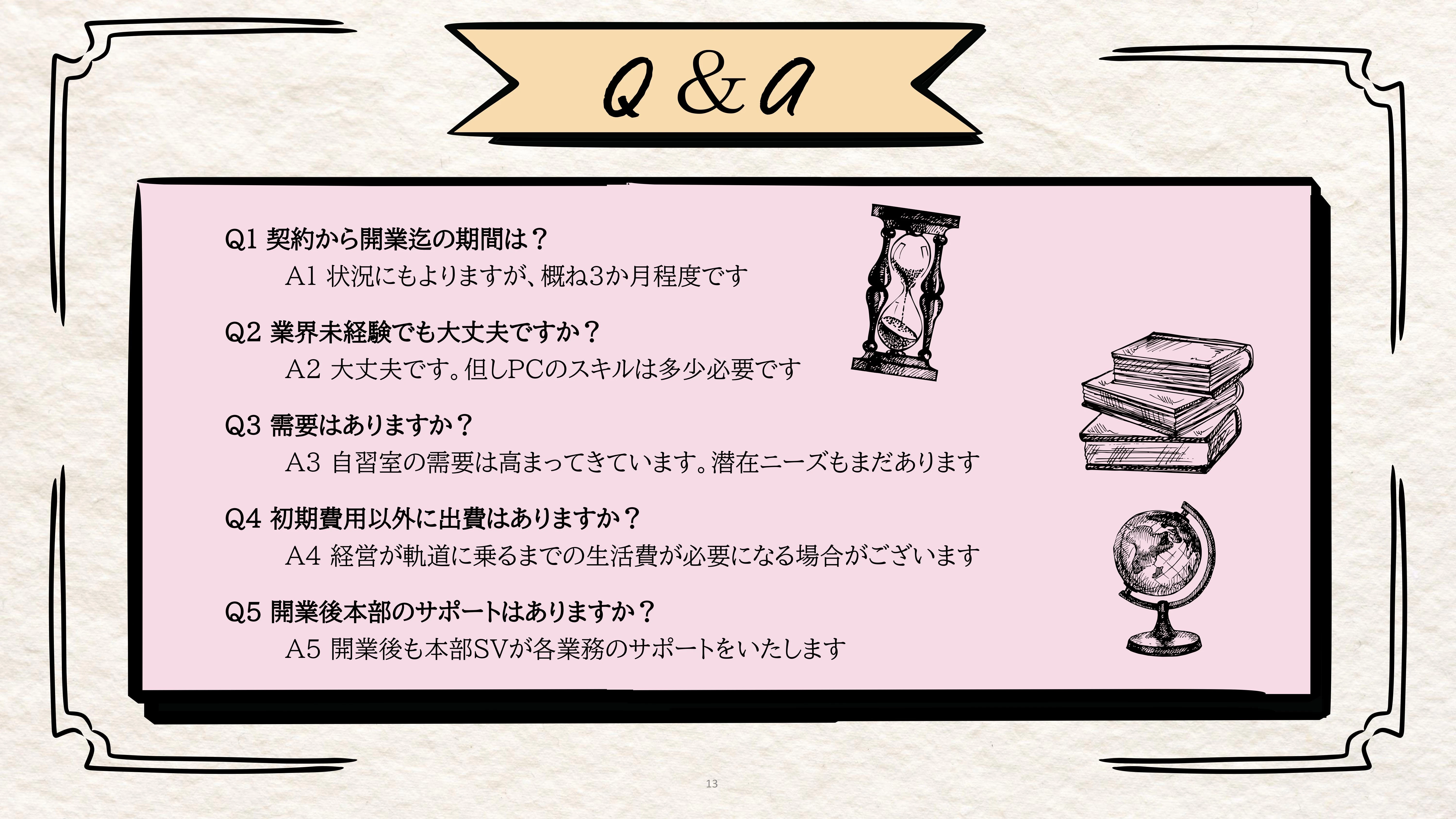 | 強み | ・会話禁止、PC音も不可の完全静音空間 ・女性も安心なセキュリティ/清潔空間 ・科学的、心理学的に設計された落ち着いて集中可能な室内環境 ・初期費用が抑えられ、省人力&無人運営が可能 ・既存FC加盟者の再加盟率が高いことも信頼の証 ・駅近立地×定額制で高継続率とストック型ビジネスで安定収益を実現 |
